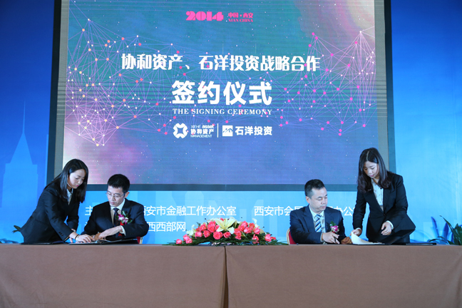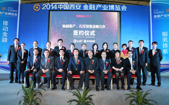 10月12日,陜西石洋投資管理有限公司(石洋投資)與陜西協(xié)和資產(chǎn)管理有限公司(協(xié)和資產(chǎn))戰(zhàn)略合作簽約儀式在“2014中國•西安金融產(chǎn)業(yè)博覽會”主會場曲江國際會展中心隆重舉行。石羊集團董事長魏存成、協(xié)和控股董事長成建禮出席并見證簽約儀式,雙方其他領(lǐng)導和嘉賓共同參加了會議。