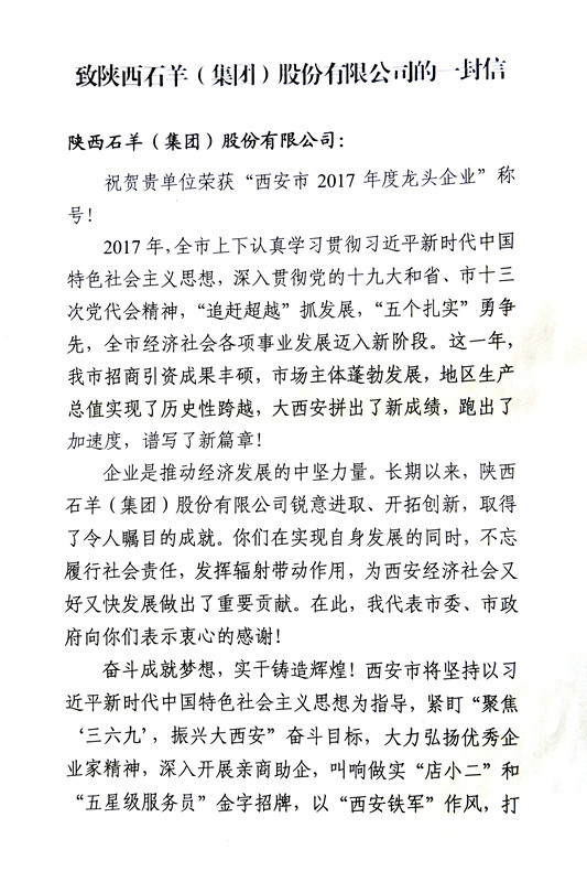 2018年10月10日上午,西安市農(nóng)業(yè)林業(yè)委員會(huì)組織召開了“西安市農(nóng)業(yè)龍頭企業(yè)50強(qiáng)授牌儀式暨龍頭企業(yè)負(fù)責(zé)人培訓(xùn)會(huì)”。會(huì)上市農(nóng)委傳達(dá)了西安市委書記王永康表彰農(nóng)業(yè)龍頭企業(yè)50強(qiáng)的批示精神,為西安市農(nóng)業(yè)龍企業(yè)50強(qiáng)進(jìn)行了授牌,并宣讀了王永康書記致石羊集團(tuán)的一封信。