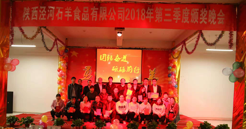 2018年10月14日,陜西涇河石羊食品有限公司在公司宴會(huì)廳隆重舉行“2018年第三季度文藝晚會(huì)暨表彰大會(huì)”。當(dāng)天,涇河食品公司所有家人歡聚一堂,熱情似火,一起總結(jié)2018年第三季度的成就與不足,同時(shí)展望第四季度的方向和目標(biāo)。大會(huì)同時(shí)表彰了2018年第三季度為公司發(fā)展作出突出貢獻(xiàn)的優(yōu)秀員工、質(zhì)量標(biāo)兵、技術(shù)標(biāo)兵、創(chuàng)新能手和優(yōu)秀管理團(tuán)隊(duì)。
