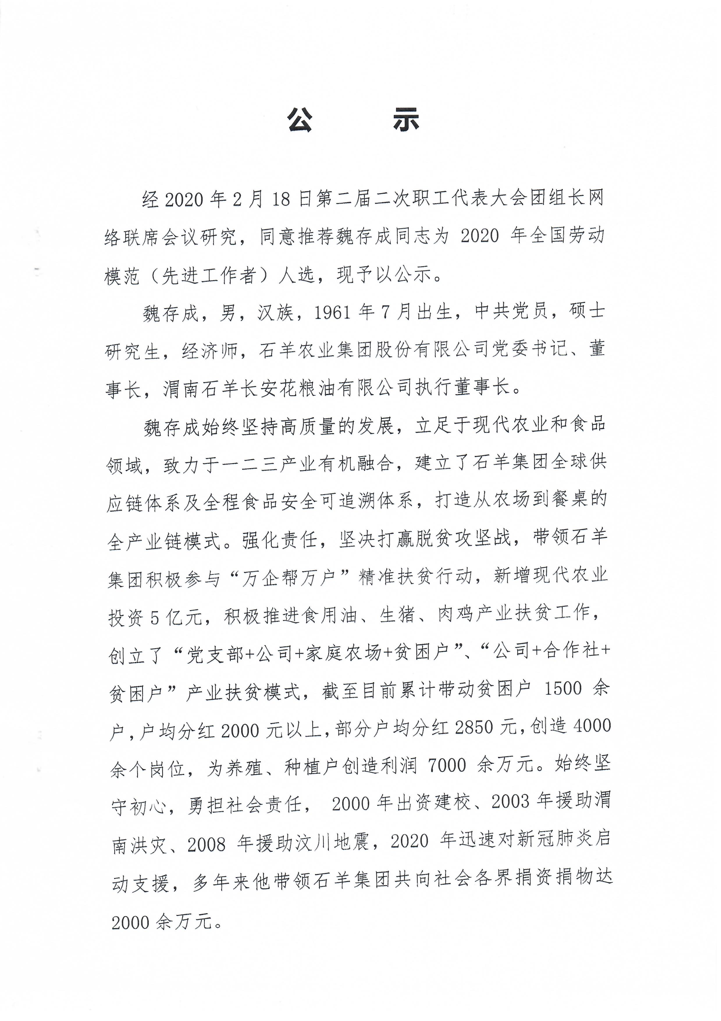 關(guān)于推薦魏存成為全國勞動(dòng)模范(先進(jìn)工作者)人選的公示