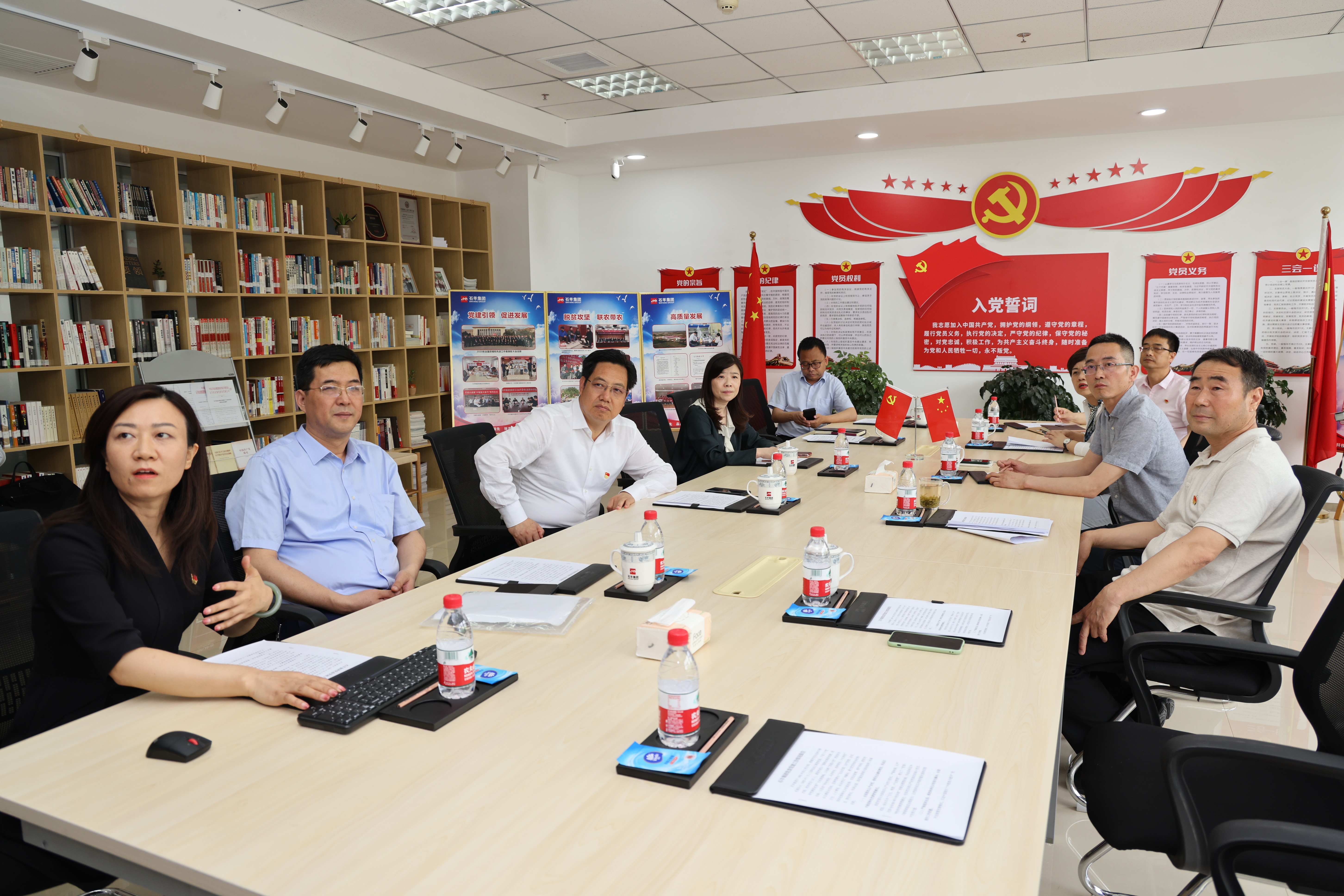 在集團黨群服務(wù)中心,魏存成匯報了集團黨委堅持“圍繞發(fā)展抓黨建、抓好黨建促發(fā)展”的總體思路,在黨建引領(lǐng)、促進發(fā)展,抗擊疫情、穩(wěn)產(chǎn)保供,脫貧攻堅、聯(lián)農(nóng)帶農(nóng),布局全國、高質(zhì)量發(fā)展等方面取得的成果,并對經(jīng)開區(qū)一直以來給予石羊集團發(fā)展的關(guān)懷和支持表示感謝。
