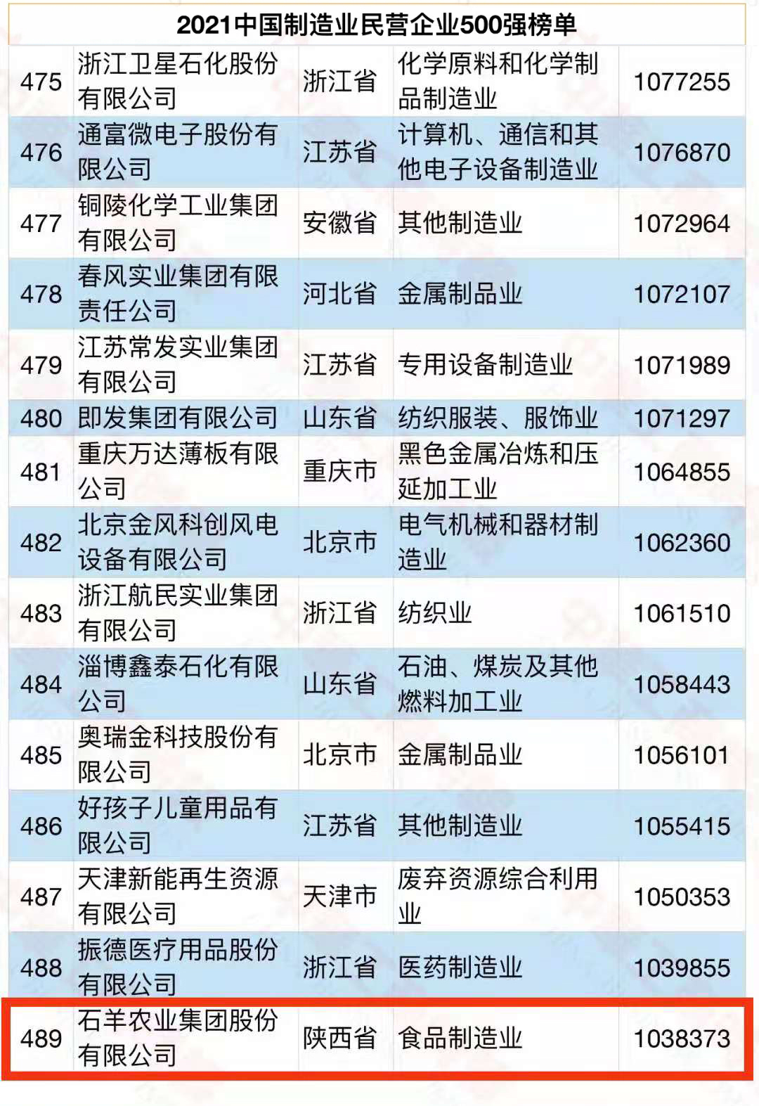 同日,全國工商聯(lián)在湖南長沙發(fā)布了2021中國民營企業(yè)500強(qiáng)、中國制造業(yè)民營企業(yè)500強(qiáng)、中國服務(wù)業(yè)民營企業(yè)100強(qiáng)三個(gè)榜單。其中,2021中國制造業(yè)民營企業(yè)500強(qiáng)入圍門檻100.51億元,石羊集團(tuán)榮列榜單第489位。