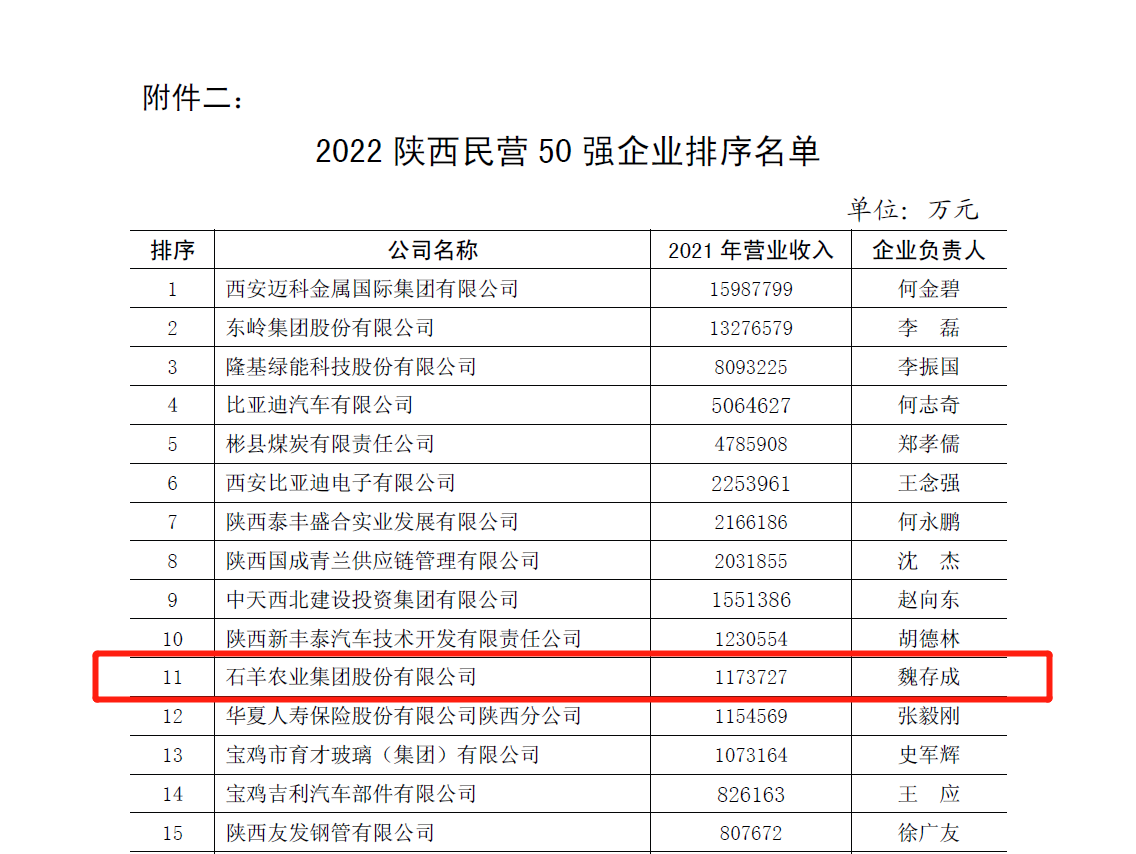 12月18日,由陜西省企業(yè)家協(xié)會(huì)牽頭開展的2022年度陜西百強(qiáng)企業(yè)排序工作已經(jīng)順利完成,并官方公布。石羊集團(tuán)以年收入117億元榮登“2022陜西100強(qiáng)企業(yè)”榜單第43位,較去年上升2位。