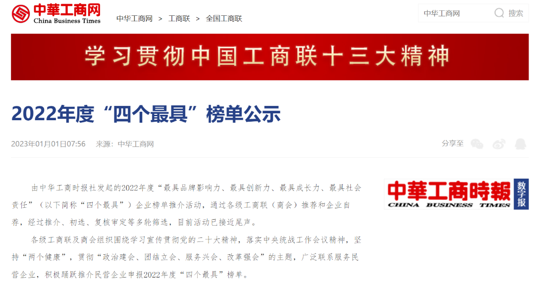 評選榜單經(jīng)各地方工商聯(lián)、商會(huì)推薦和企業(yè)自薦,中華工商時(shí)報(bào)社“四個(gè)最具”推選委員會(huì)辦公室初選以及推選委員會(huì)復(fù)核審定產(chǎn)生。“2022最具社會(huì)責(zé)任企業(yè)”榜單從抗擊疫情、抗洪救災(zāi)、參與“萬企幫萬村”等方面進(jìn)行認(rèn)定。